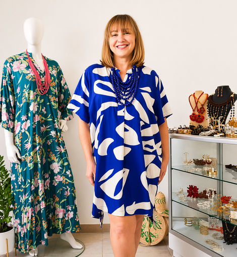 Este tunic dress combina un diseño moderno con una silueta suelta que favorece y estiliza sin esfuerzo. Su tela en polyamide es ligera, fresca y de caída suave, perfecta para un look elegante pero cómodo.