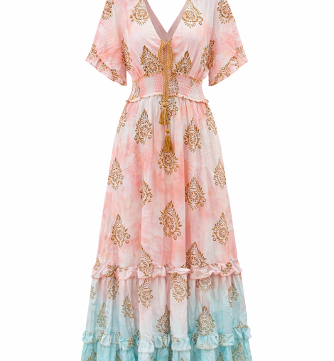 Este maxi dress estilo boho combina una silueta fluida con detalles delicados en beads que elevan toda la pieza. Su tela en viscosa es ligera, fresca y perfecta para climas cálidos, mientras el elástico en cintura define sin apretar, logrando un fit cómodo y favorecedor.